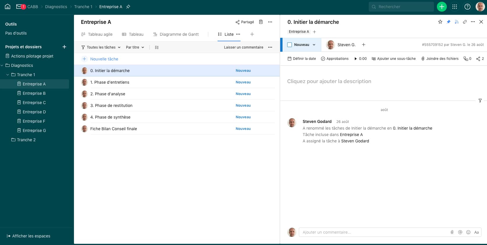 Chaque Projet ou Dossier peut comporte des informations et des tâches. Chaque tâche comporte la description du travail à réaliser, des sous-tâches (si pertinent), les commentaires de l’équipe et les fichiers liés à la tâche, et les dépendances avec les autres éléments du projet.